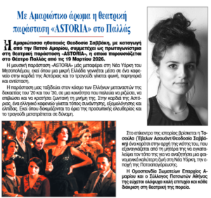 Η Αμαριώτισσα ηθοποιός Θεοδοσία Σαββάκη, με καταγωγή από την Πατσό Αμαρίου, συμμετέχει ως πρωταγωνίστρια στη θεατρική παράσταση «ASTORIA», η οποία παρουσιάζεται στο Θέατρο Παλλάς από τις 19 Μαρτίου 2026.